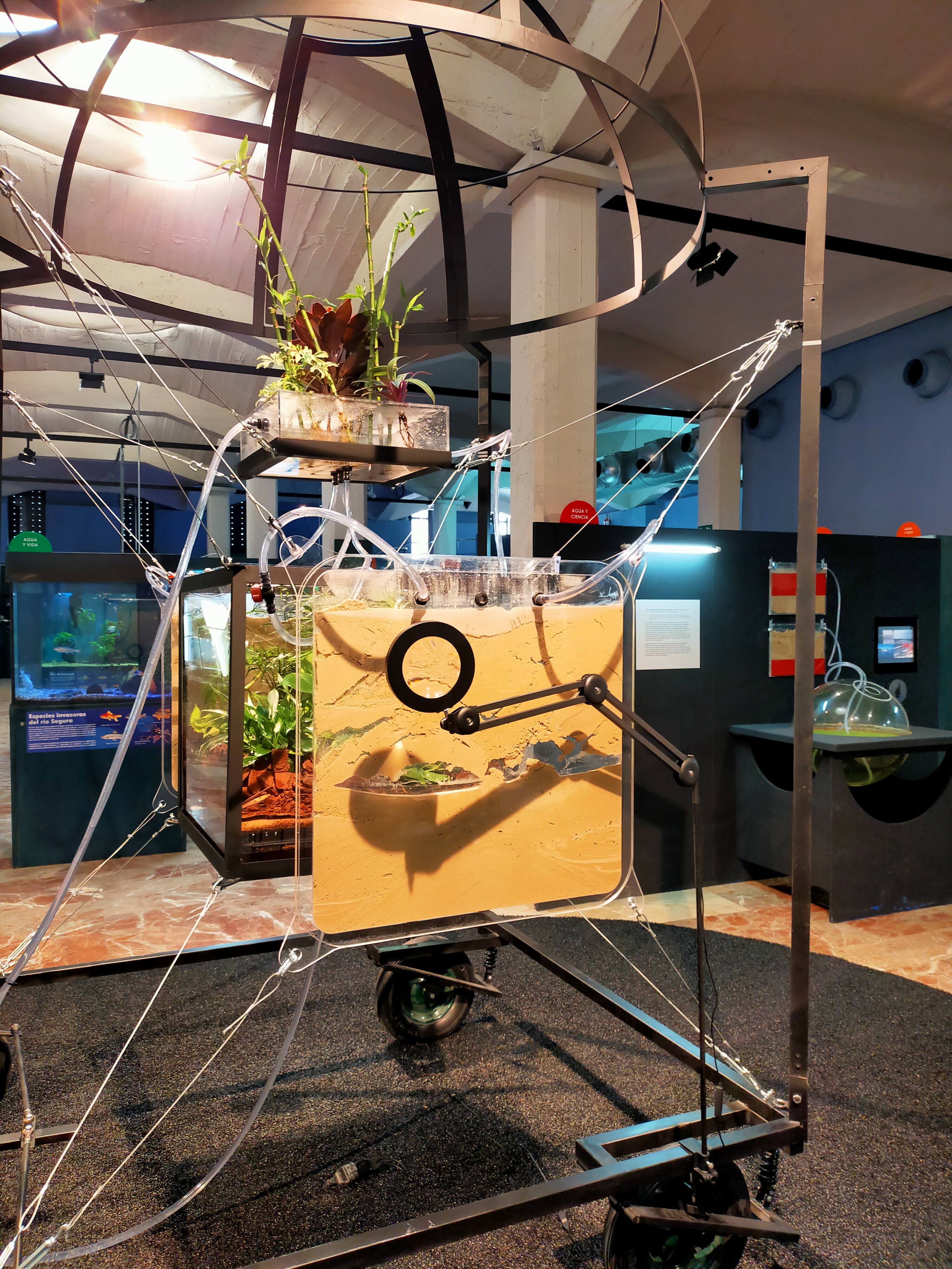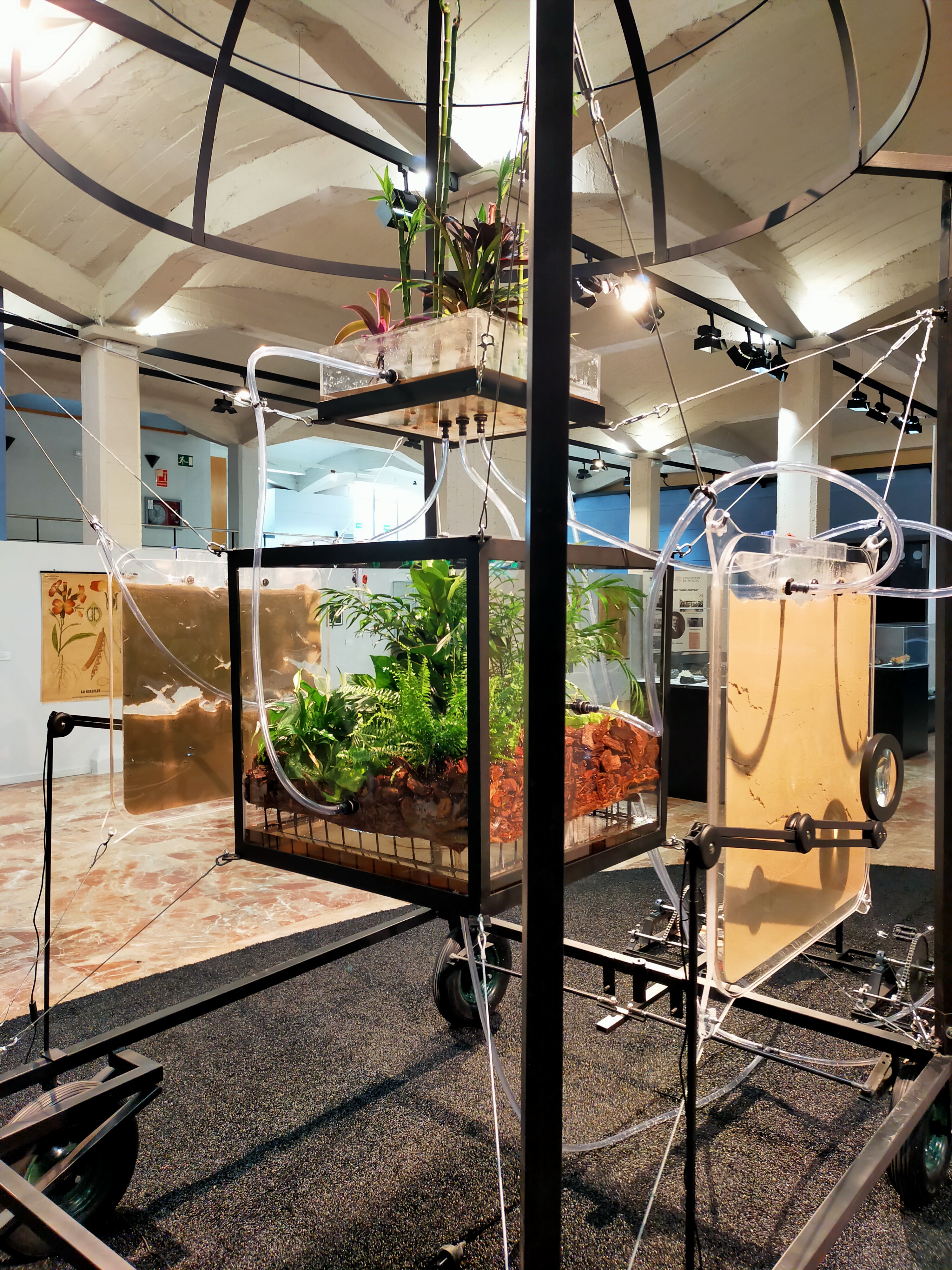 ︎ Mixed technique installation: Iron structure (320 cm high, 170 cm wide, 170 cm deep) with two water cyclobombs, piping system, methacrylate urns, plants, geotextile, sand and clay, substrate and filters, two anthills with colonies of Messor barbarus ants.