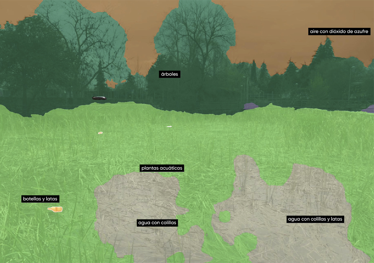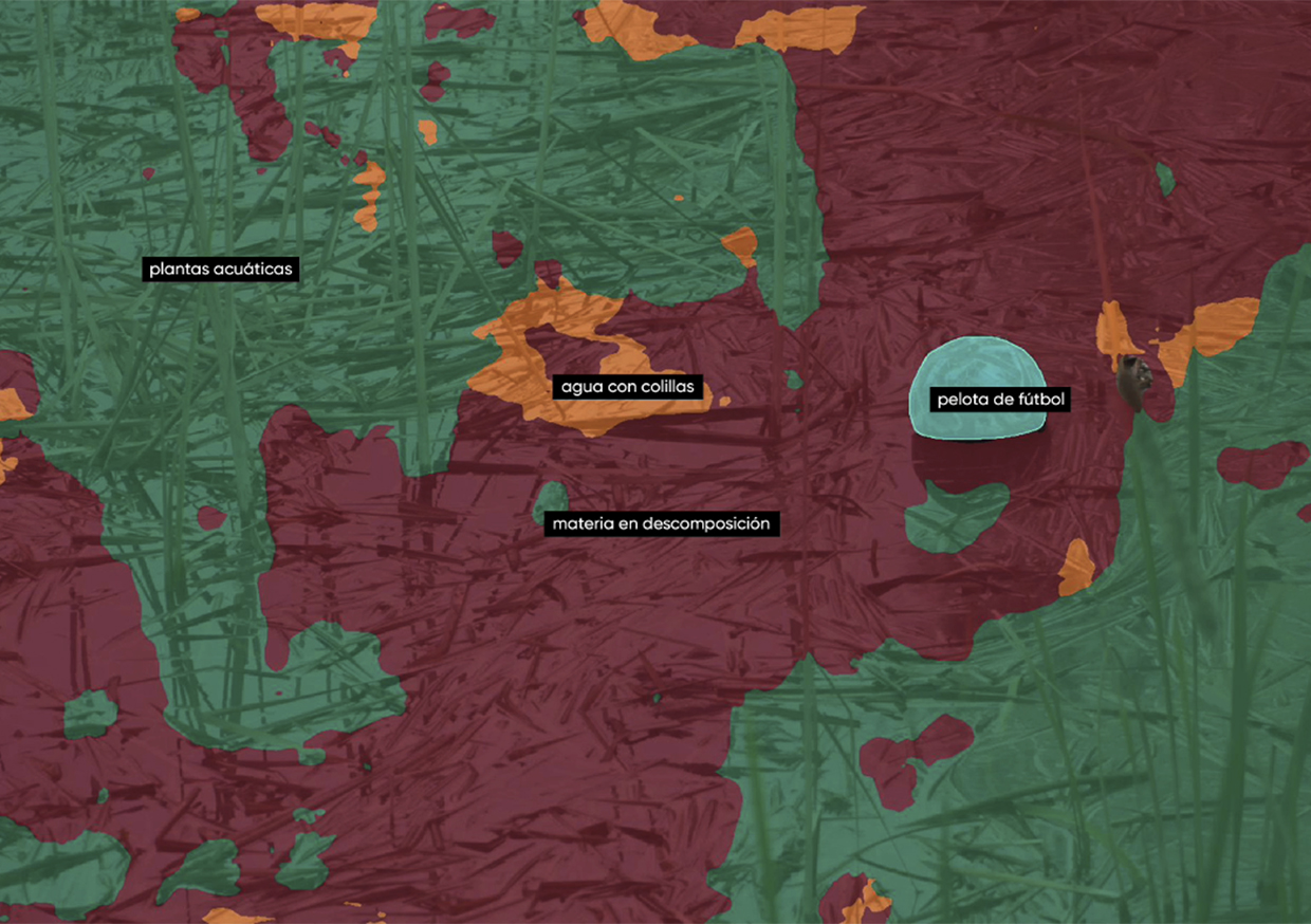 En el proceso de edición del vídeo, empleé una inteligencia artificial con capacidades de reconocimiento de objetos mediante aprendizaje automático, lo que me permitió mapear los diversos elementos presentes en la imagen. Mi objetivo no se limitaba a evaluar si la composición del agua cumplía con los criterios técnico-sanitarios para su potabilidad, sino también a identificar las huellas humanas impresas en el paisaje ribereño. En otras palabras, busqué evidenciar e interpretar las trazas antrópicas que nos narran la historia, el presente y el futuro de la convivencia entre humanos y no-humanos. La pregunta que surge es: ¿qué nos comunica el agua? ¿Qué mapa trazan sus datos? ¿Estamos dispuestos a escuchar y traducir sus datos?
