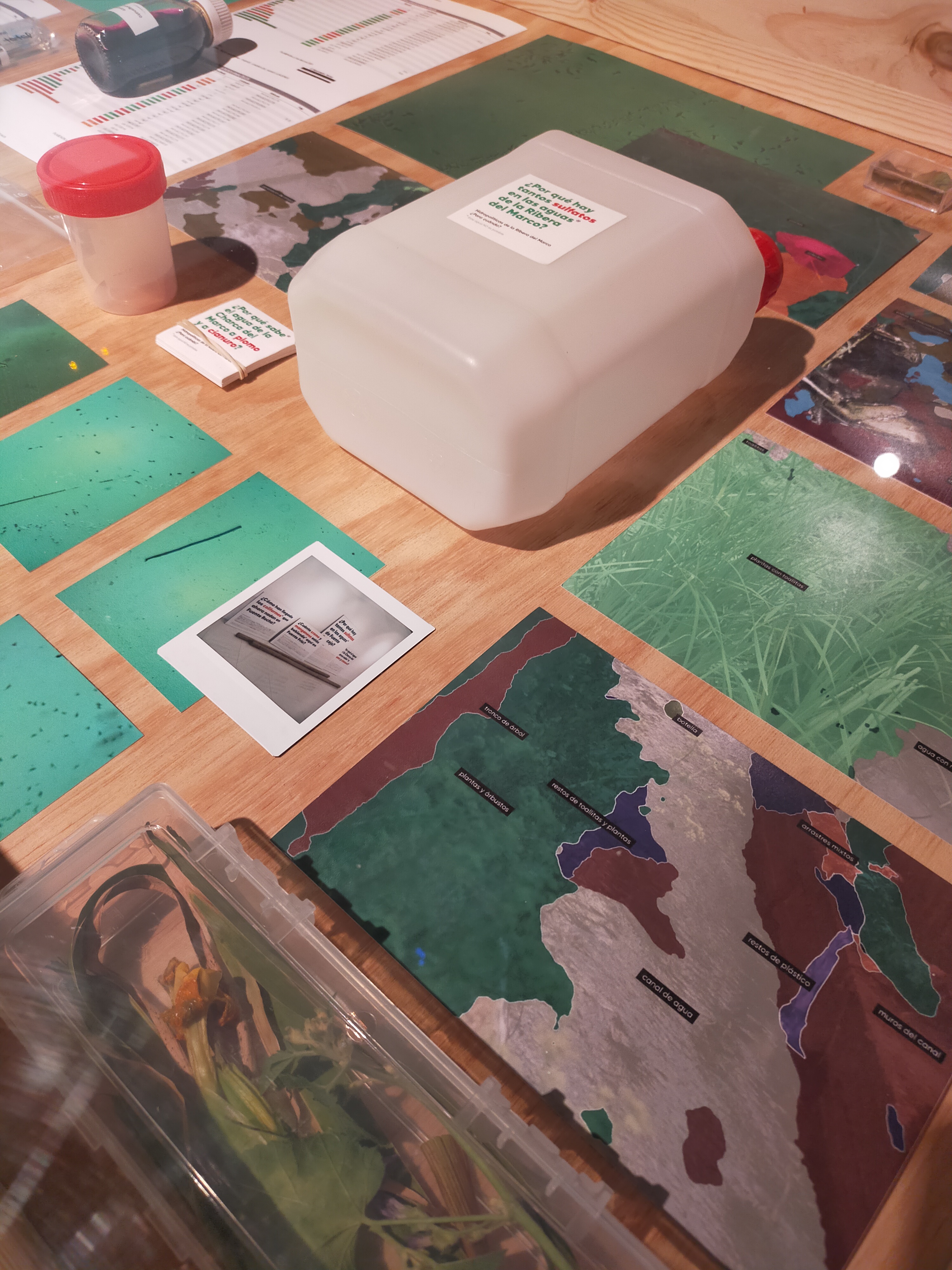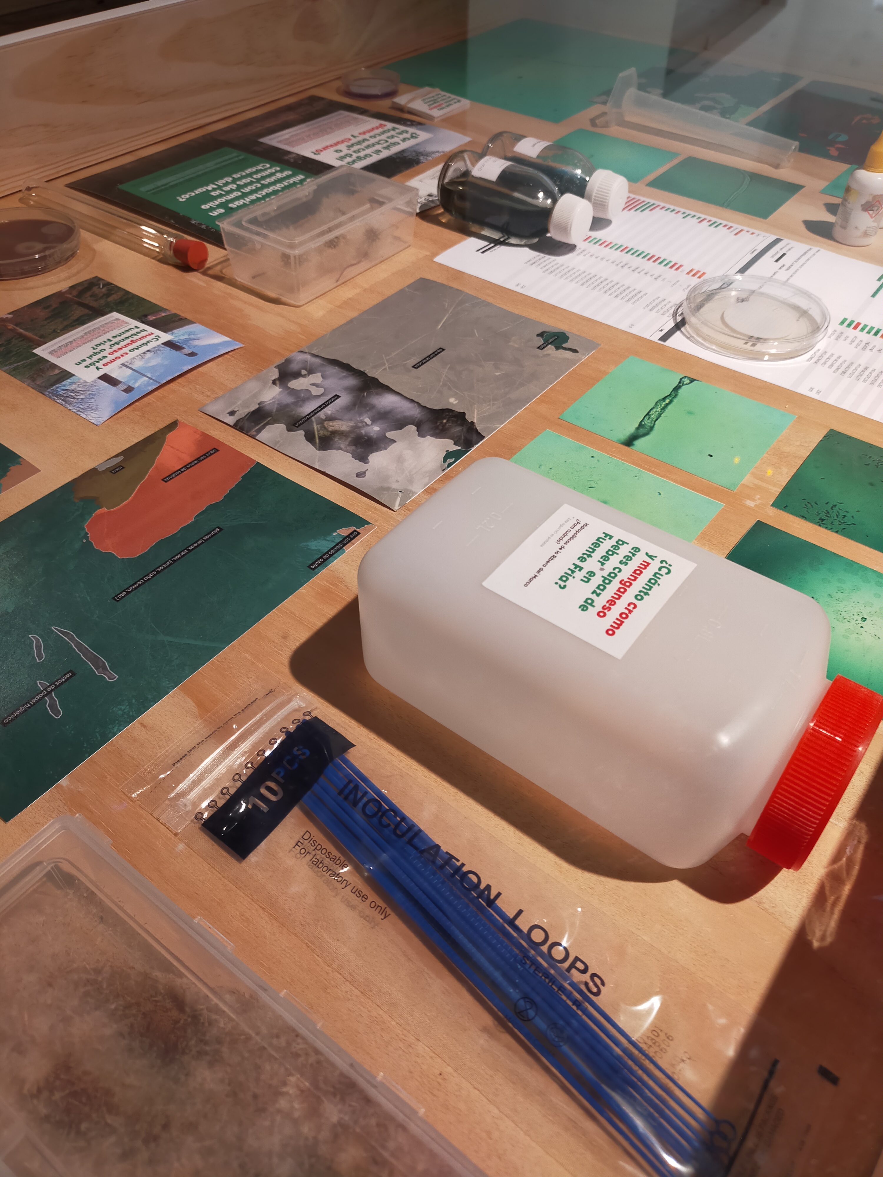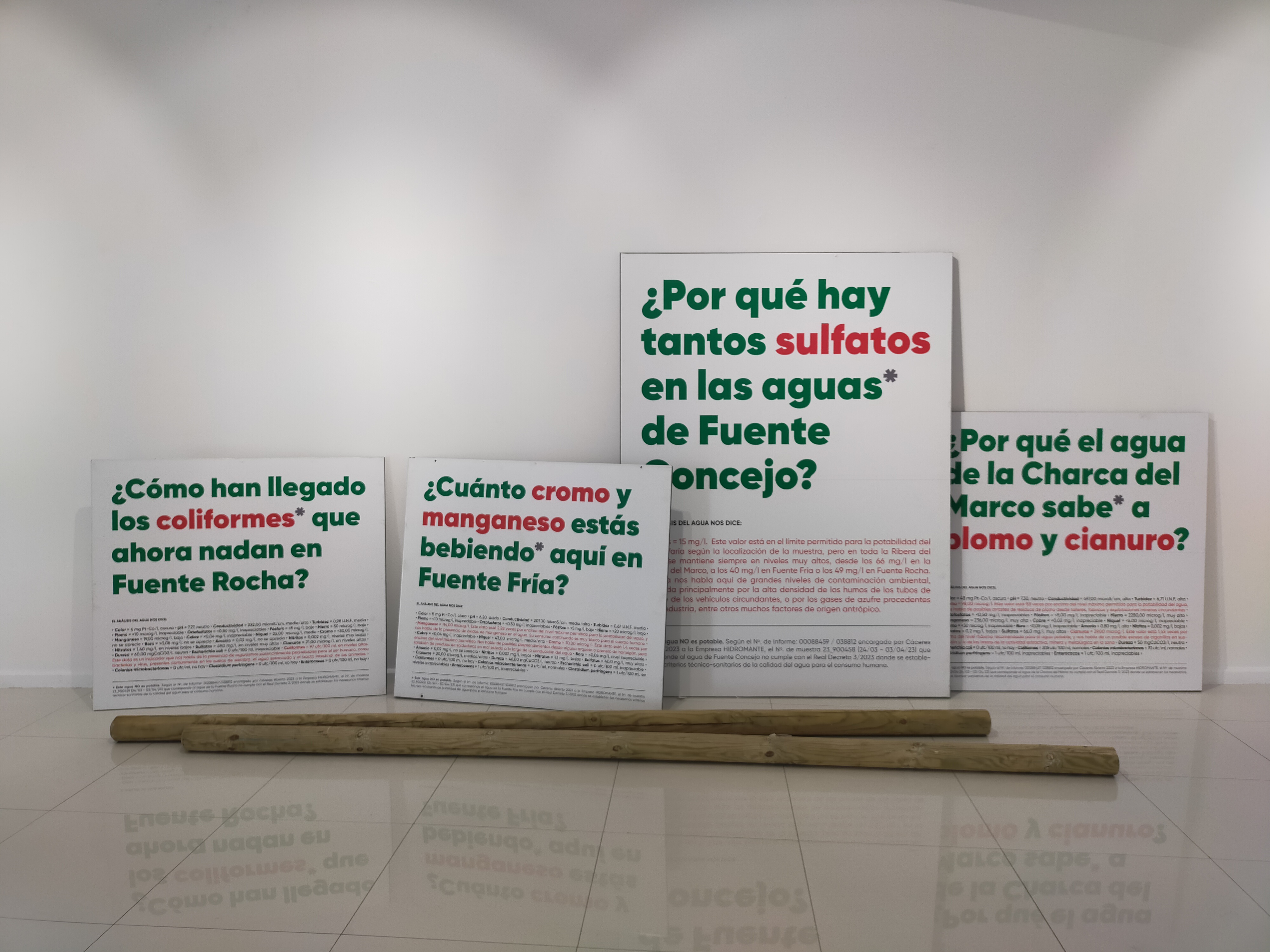 Based on the scientific data obtained, several posters were specifically designed for installation in the public space of La Ribera del Marco (pending the corresponding permits). However, these posters were censored by the Cáceres City Council a few days before the inauguration of Cáceres Abierto 4 (UTOPIANISM / COLLAPSE / RECONSTRUCTION). Consequently, it was decided to exhibit them in the Sala de Arte El Brocense, along with a video projection and display tables containing all the laboratory analyses and results, as well as the project's graphic documentation.