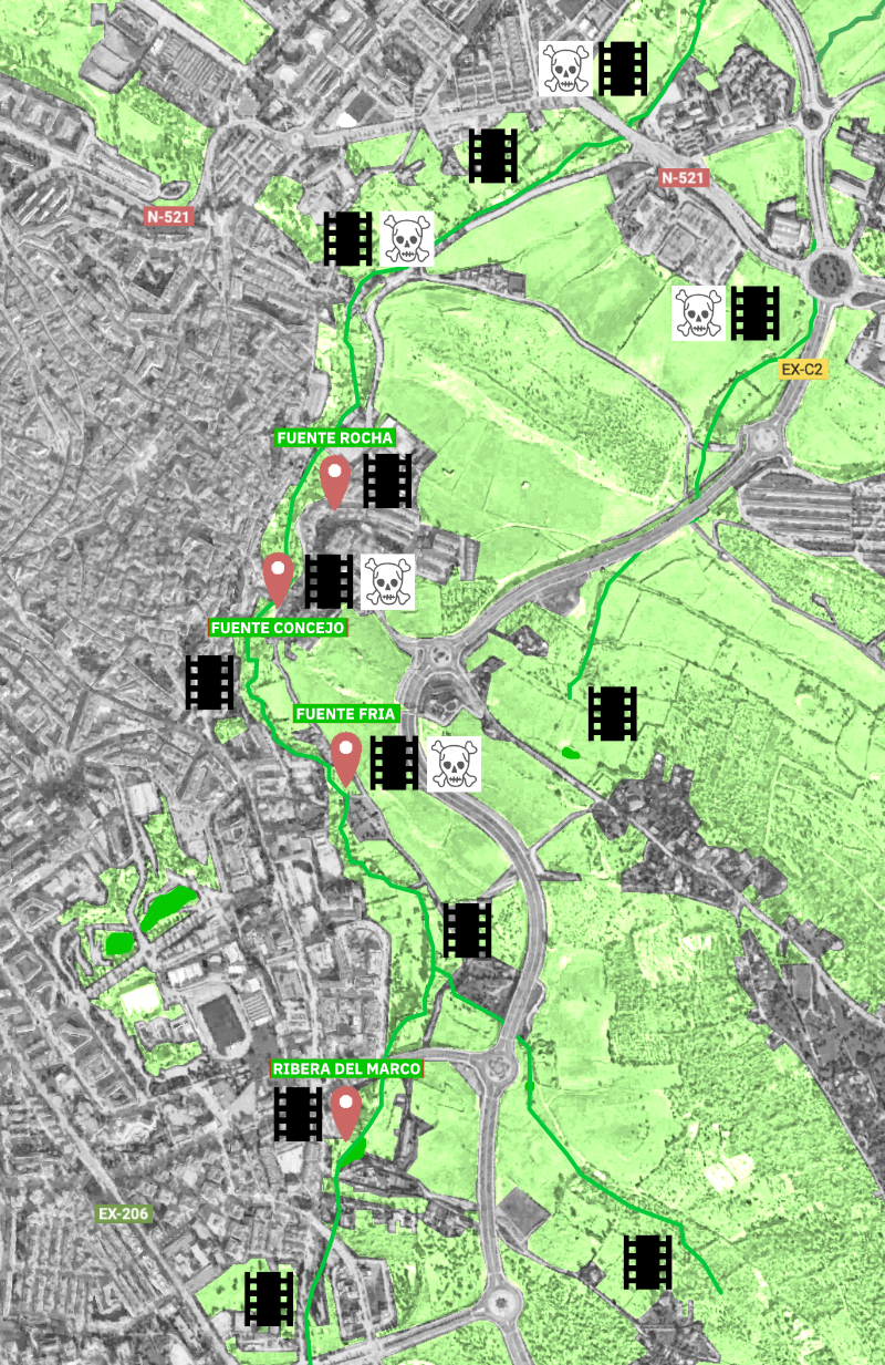 The present project was dedicated to the exhaustive analysis of the current quality and composition of the waters of La Ribera del Marco, the river course that enabled the first human settlements in Cáceres (Spain) during the Upper Paleolithic and which, ever since, has supplied the essential resources for the city's urban development. Currently, however, the city (and its political governance) appear disconnected from their origins, from the natural legacy that has shaped the landscape, and from the considerable geological and biological heritage that still harbors a notable diversity of fauna and flora species.