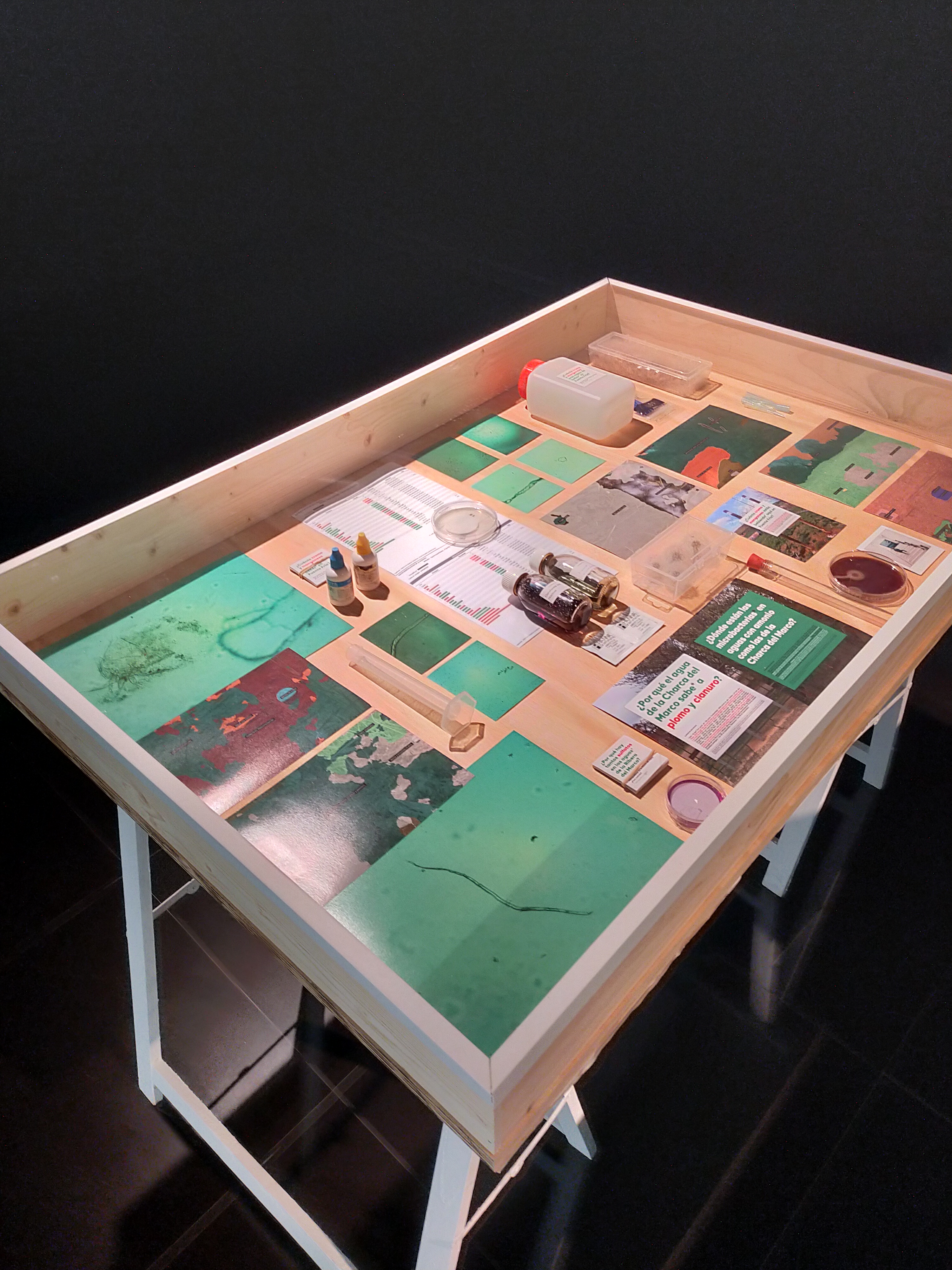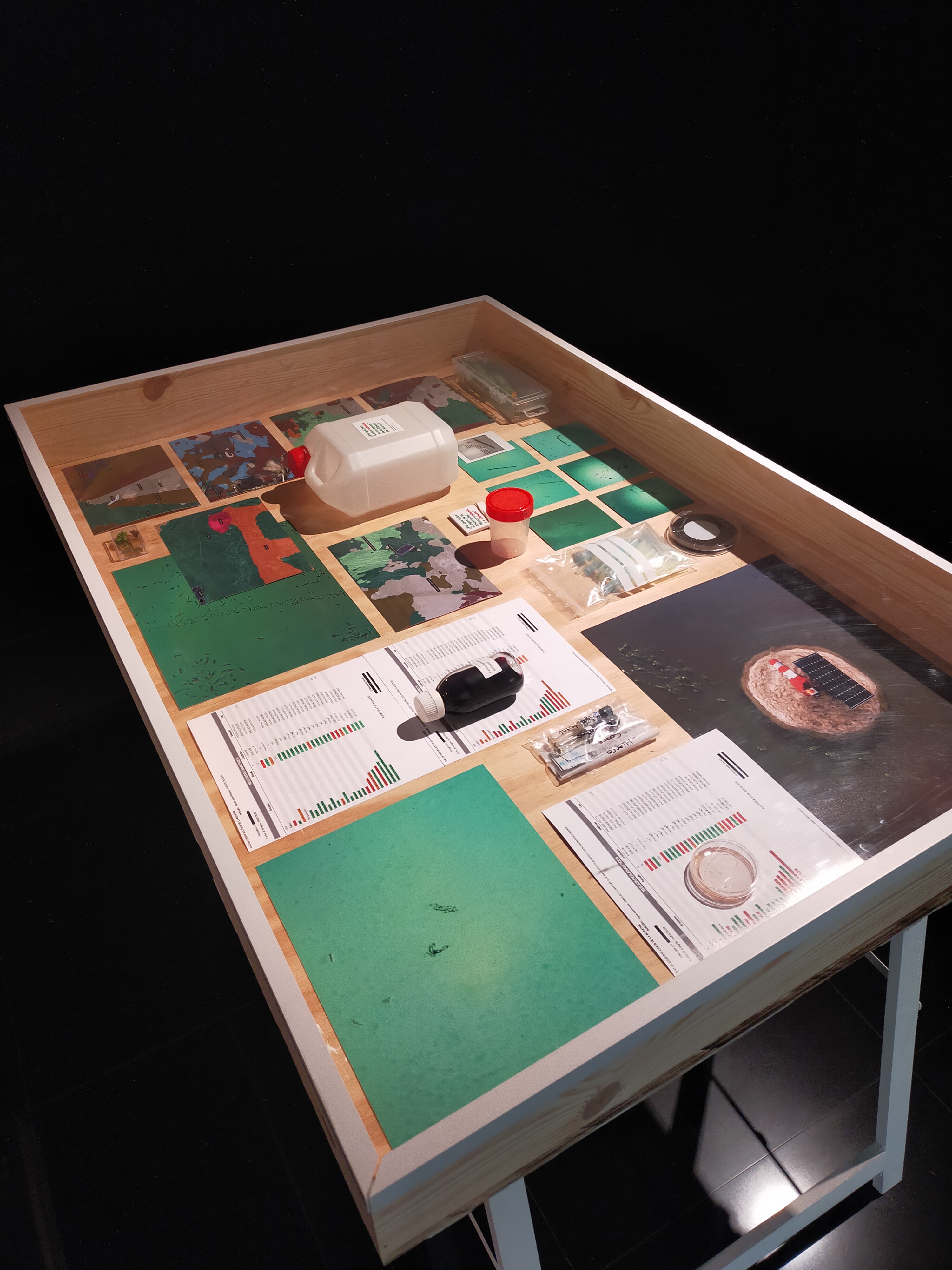 Based on the scientific data obtained, several posters were specifically designed for installation in the public space of La Ribera del Marco (pending the corresponding permits). However, these posters were CENSORED by the Cáceres City Council a few days before the inauguration of Cáceres Abierto 4 (UTOPIANISM / COLLAPSE / RECONSTRUCTION). Consequently, it was decided to exhibit them in the Sala de Arte El Brocense, along with a video projection and display tables containing all the laboratory analyses and results, as well as the project's graphic documentation.