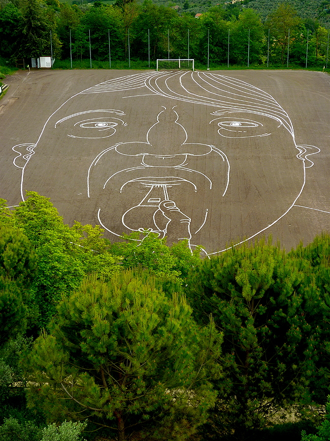 For this date, I made a portrait with white lime on the pitch, which would only be visible from a distance (in fact, the match, and the subsequent blur of the drawing, were recorded from a privileged point of view: from the top of the medieval tower of Montopoli). The recording of this performance showed that during the game the face of a local referee (who “coincidentally” looked very much like Hitler's face) was distorted without paying attention to its formal limits, thus creating an ever new, ever changing, monstrous and infinite portrait.